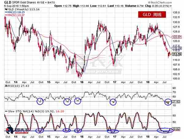 下图为GLD周线走势。基于10周RSI指标与周线随机指标,最近几周GLD已经跌至超卖领域。图中蓝圈代表RSI指标处于超卖以及随机指标低于10的时候。可以看到,过去四次指标呈现这种状态之后,GLD价格都出现反弹。