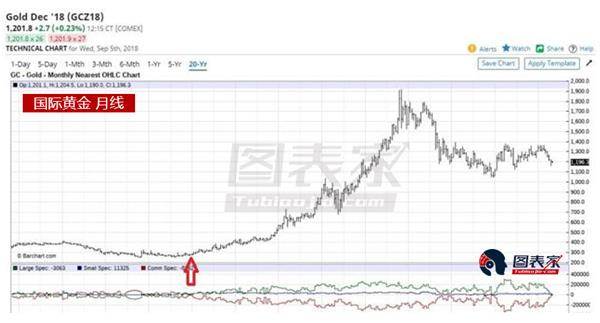 与此同时,CFTC报告显示,过去三周大型投机客持有黄金净空头头寸。上一次大型投机客净做空黄金是在2001年12月(下图红色箭头所指时间),当时金价交投于300美元下方。